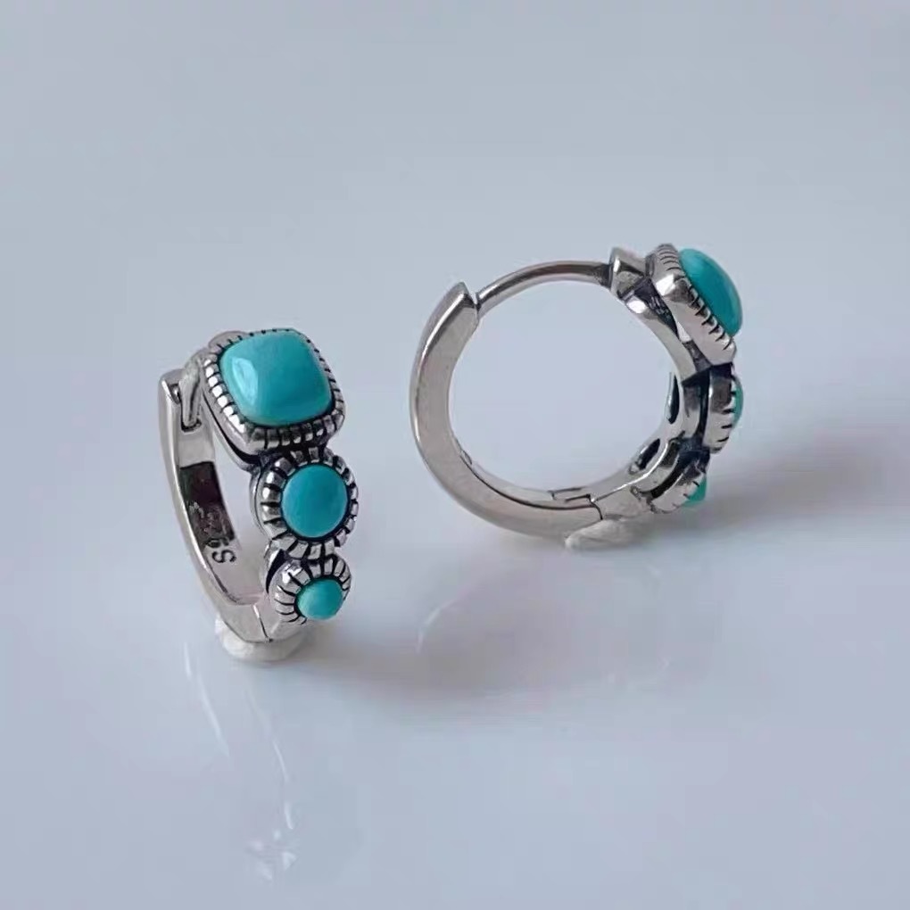 Imitation Natural S925 Silver Needle Raw Mineral Green Sodalite Blue Square Three Blue-Green Stone Couple Ethnic Style Xizang Earrings