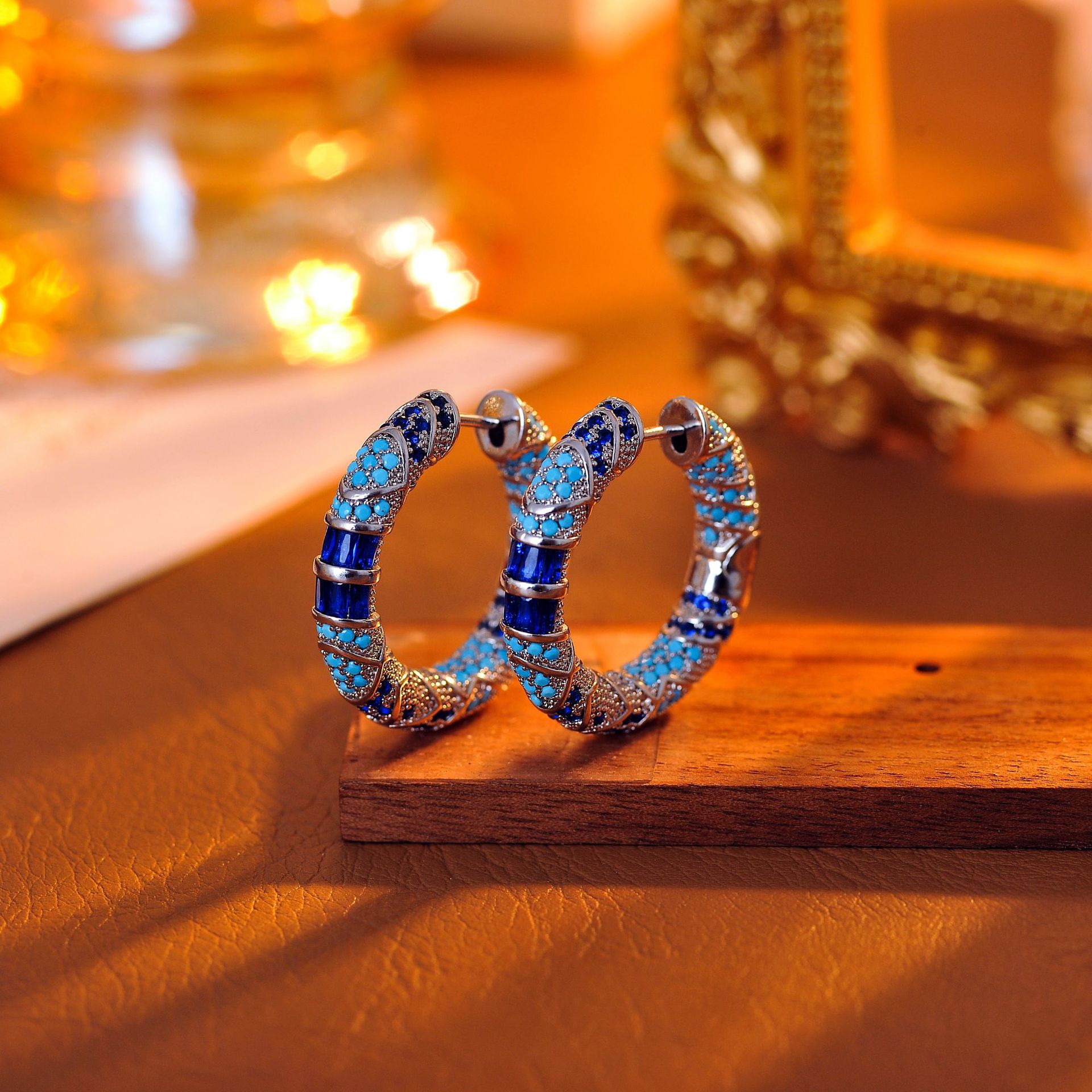 New Retro Style Blue Zircon Earrings Trendy European and American High Sense Niche Light Luxury Earrings Women's Circle Earrings Wholesale