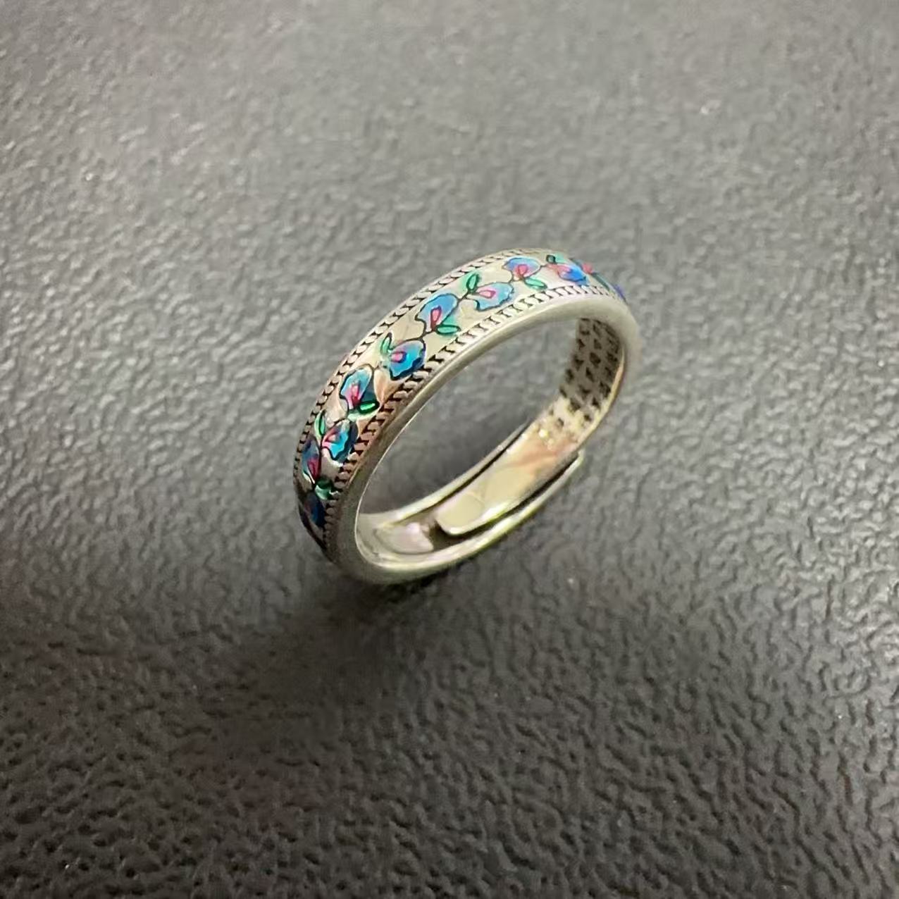 Vintage Ethnic Fashion Braced Blue Apricot Leaf Heart-sutra Ring Women's Heart-sutra Engraved Lotus Literary and Art Finger Ring