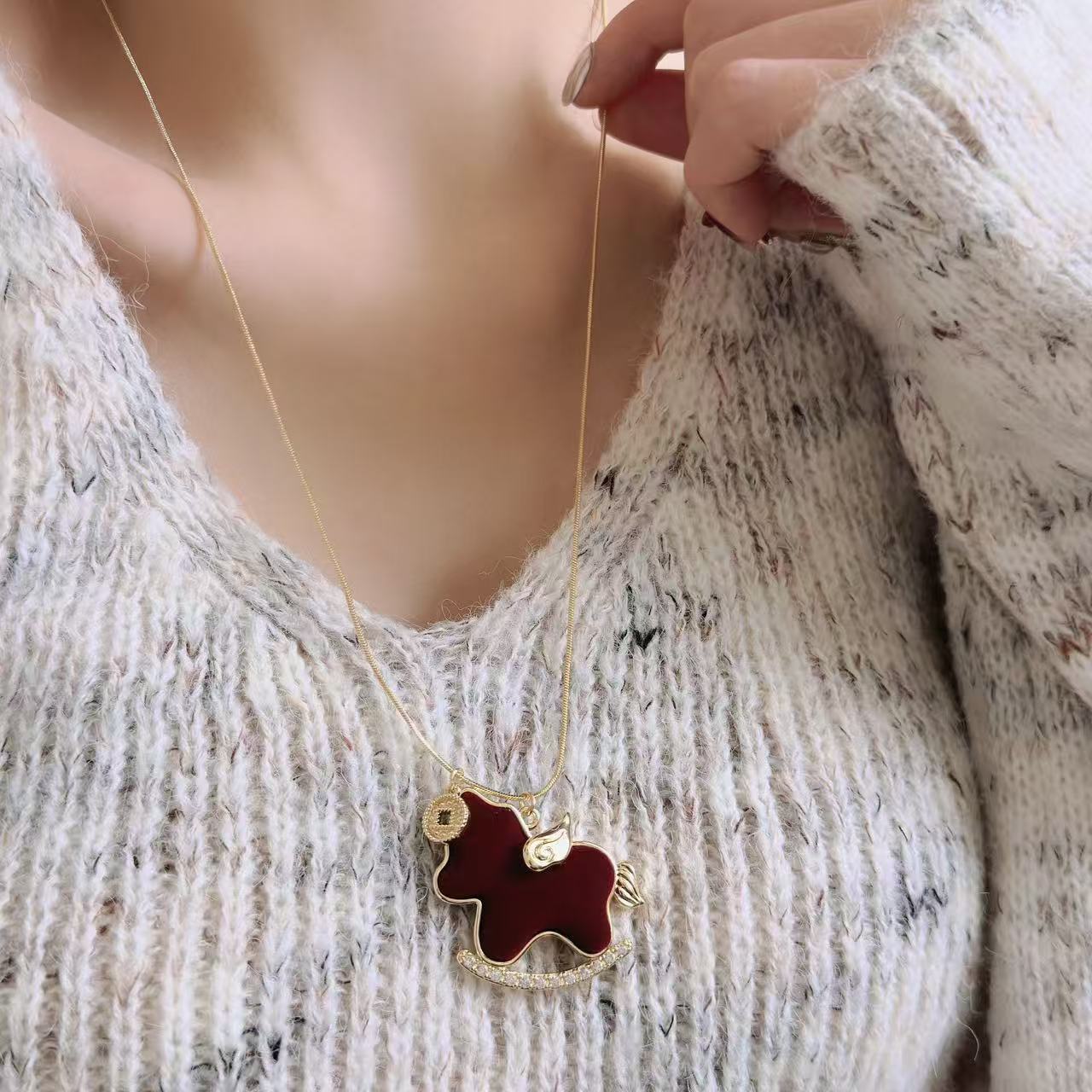 Burgundy Flocked Pony Copper Coin Pendant Necklace for Women Niche Accessible Luxury High-End Sweet and Cute Elegant Clavicle Chain