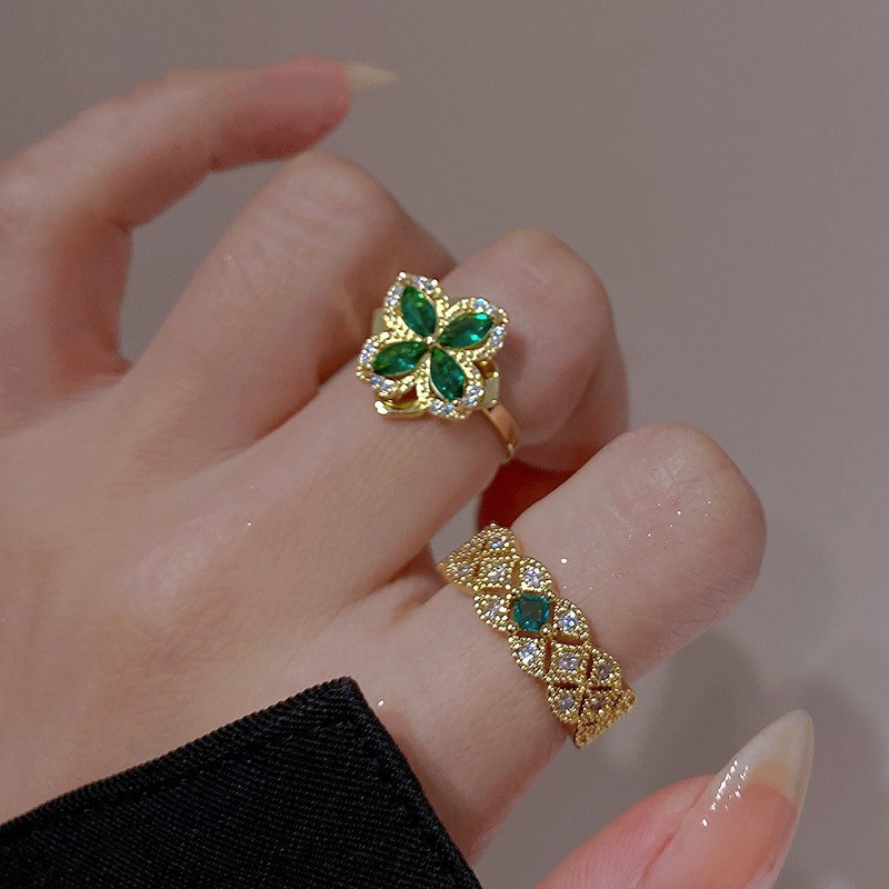 Rotatable Four-Leaf Clover Ring Tiktok Index Finger Ring European and American Emerald Gemstone Retro Palace Style Open Ring