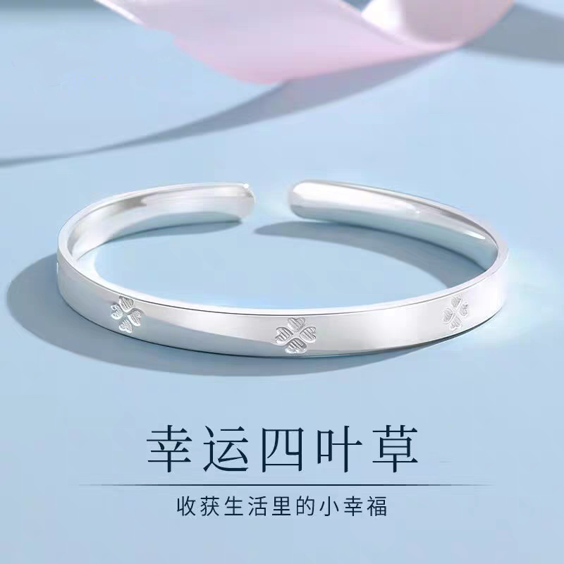 Tiktok Live Silver-Plated White Copper Clover Open Bracelet Young Style Solid Niche Light Luxury Lucky Clover Bracelet Jewelry