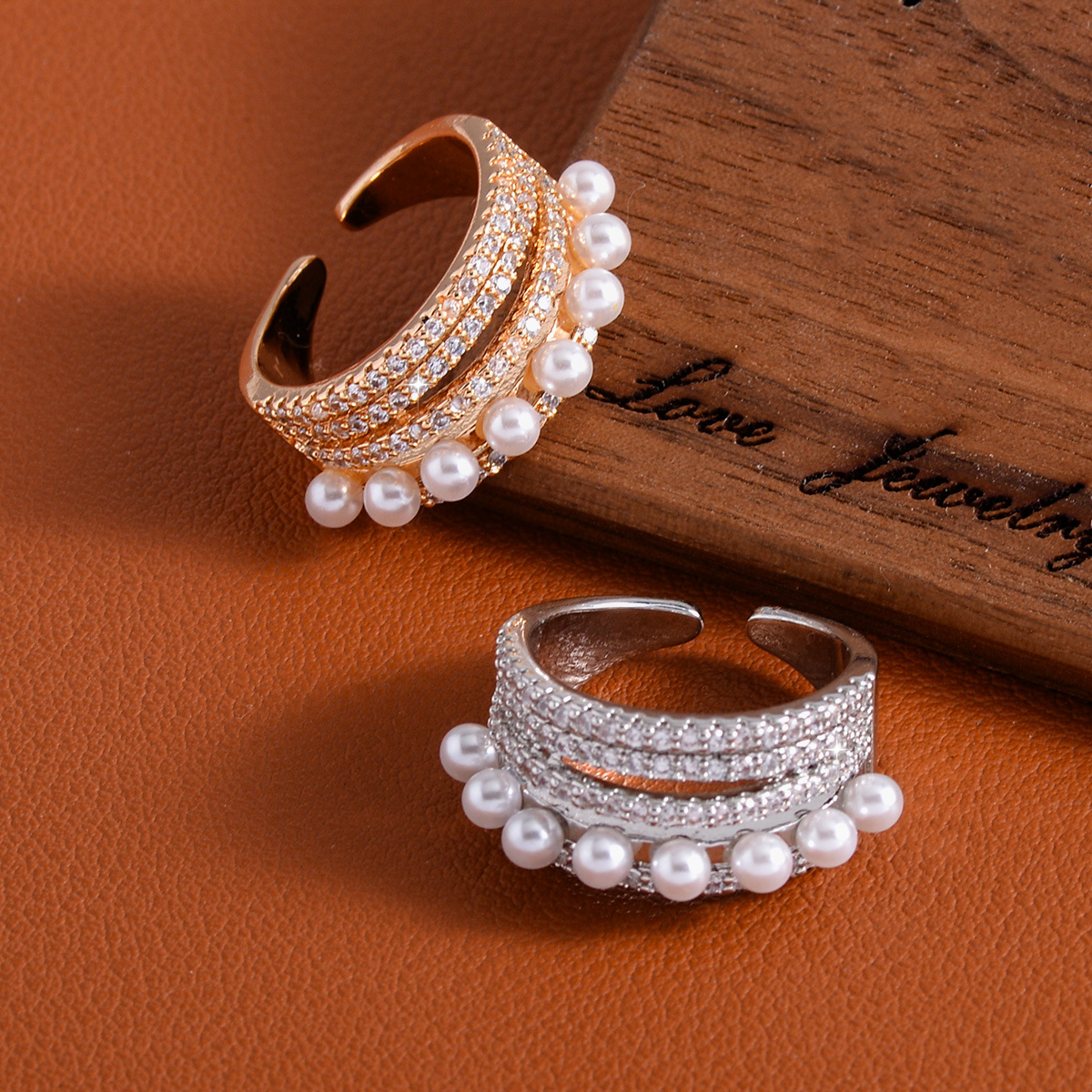 Cross-Border Shein Popular French Full Diamond Pearl Open Ring Women's Adjustable High-End Ring Jewelry