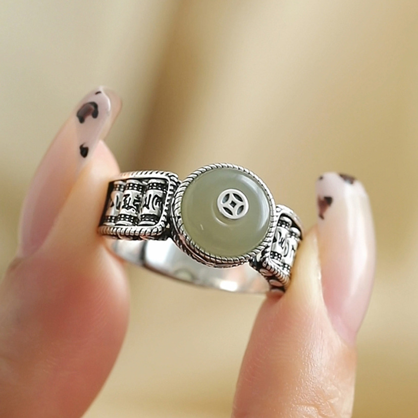 Vintage Ruyi Copper Coin Ring for Women, New Chinese Style Six-Word Mantra Peace Buckle, National Trend Artistic Ethnic Style Open Ring
