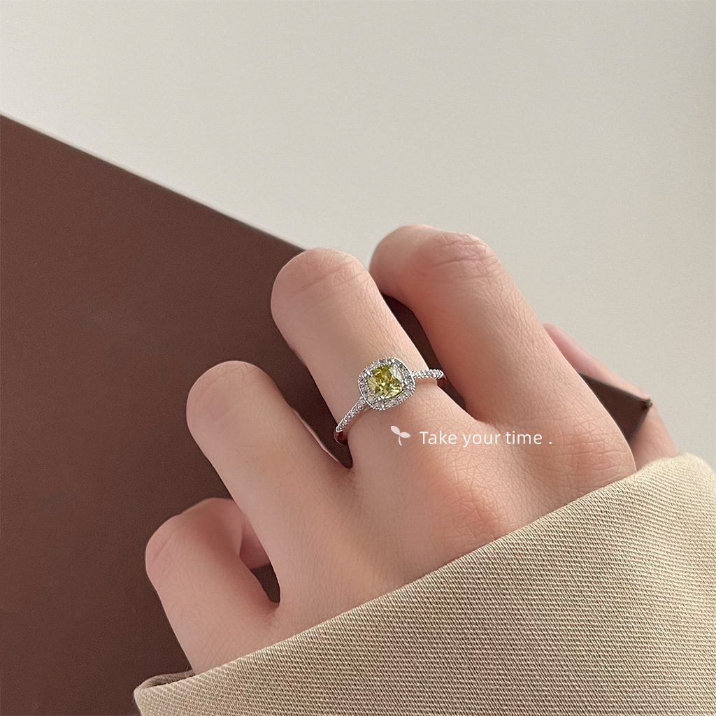 Micro-inlaid zircon square geometric plating true white gold fat square olive green opening adjustable ring advanced sense ring