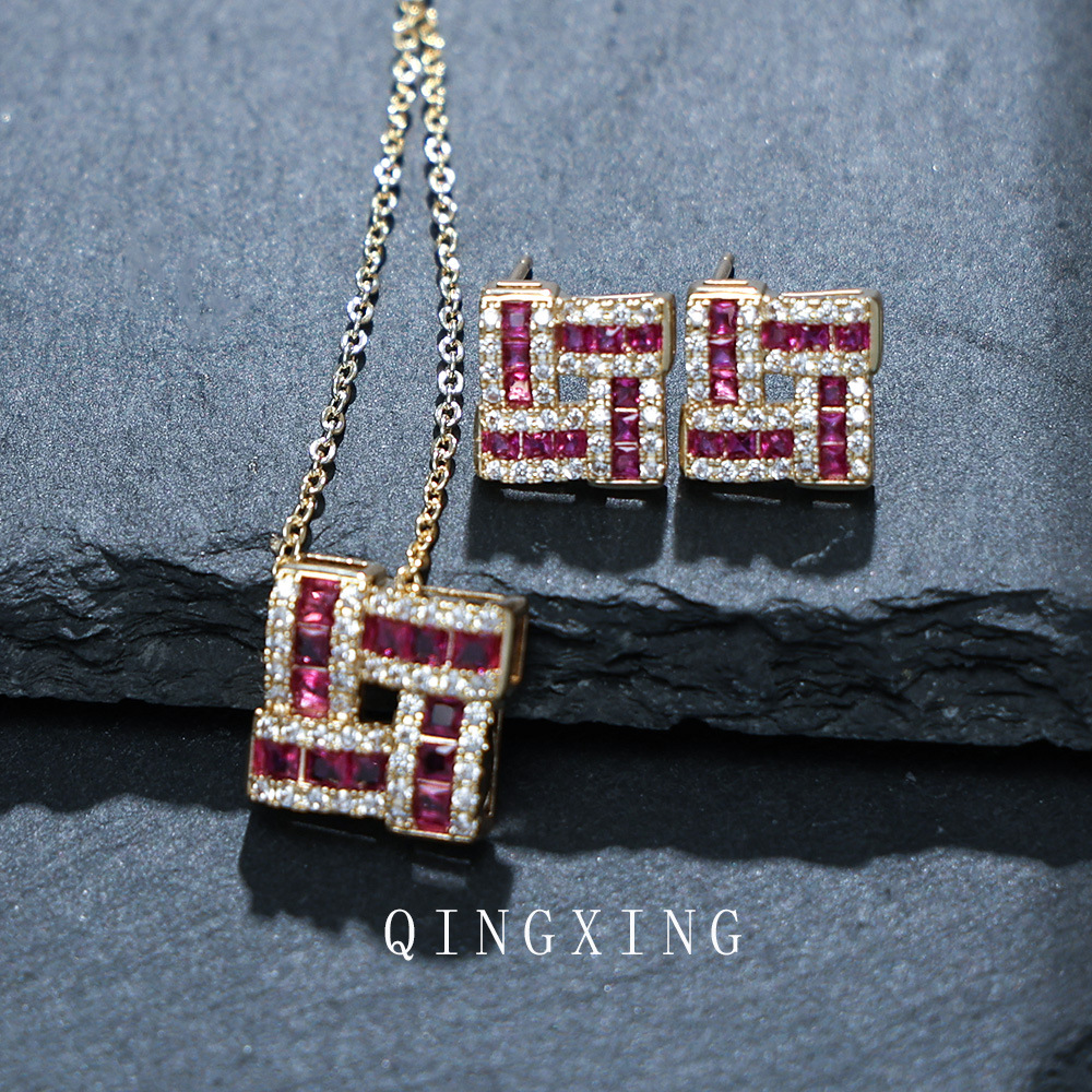 Light Luxury Design Sense Synthetic Ruby Geometric Square Earrings Pendant Necklace Advanced Sense Color Treasure suit Jewelry