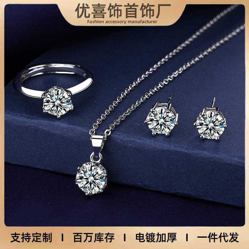 European and American Cross-Border Hot-Selling Classic Six-Claw Set Imitation Jewelry Full Diamond Ring Necklace Earrings Wholesale for Women