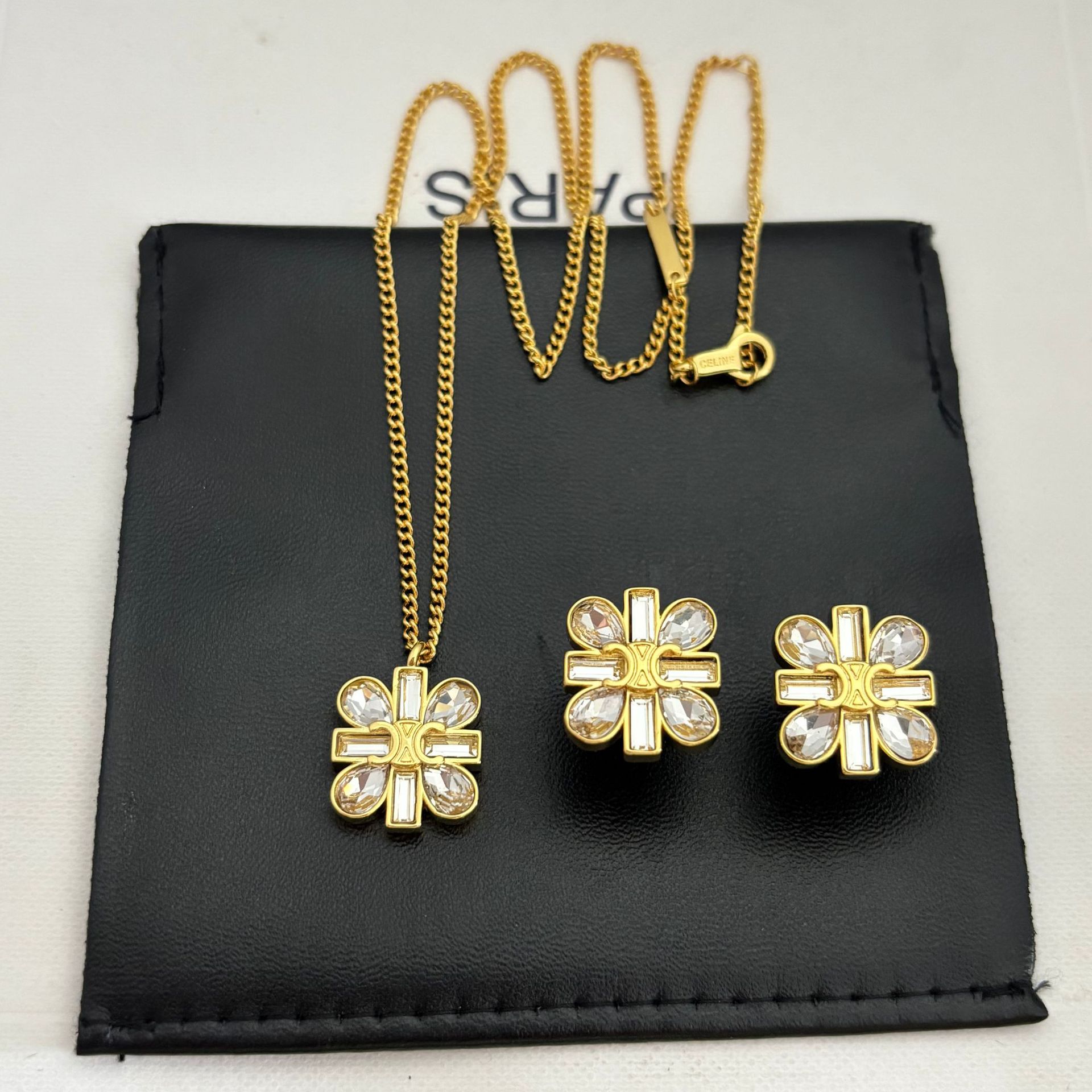 Arc De Triomphe Liu Shishi's Same Style Diamond-Encrusted Crystal Four-Leaf Clover Earrings for Women, Accessible Luxury French Earrings and Necklace Set