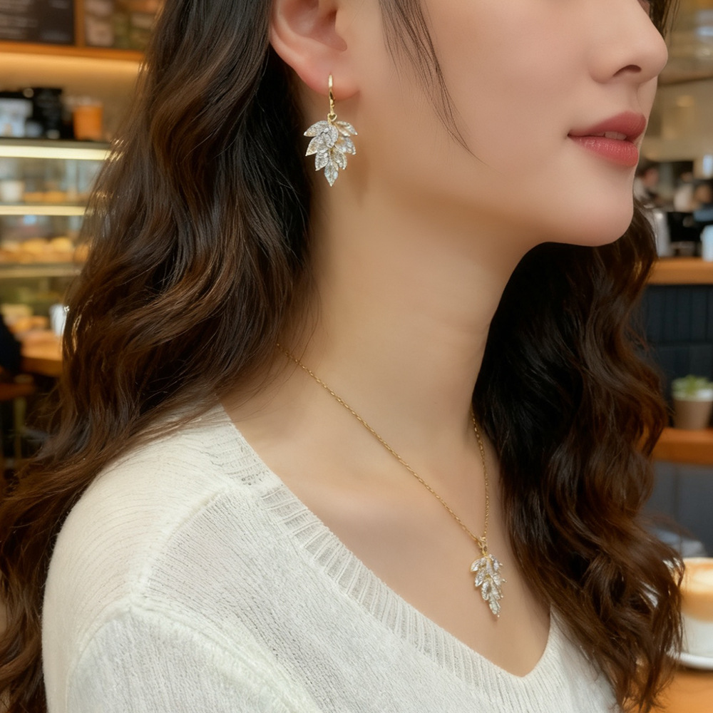 Real Gold Electroplated Micro-Paved Zircon Leaf Set Necklace French Elegant High-End Leaf Necklace and Earrings Combination