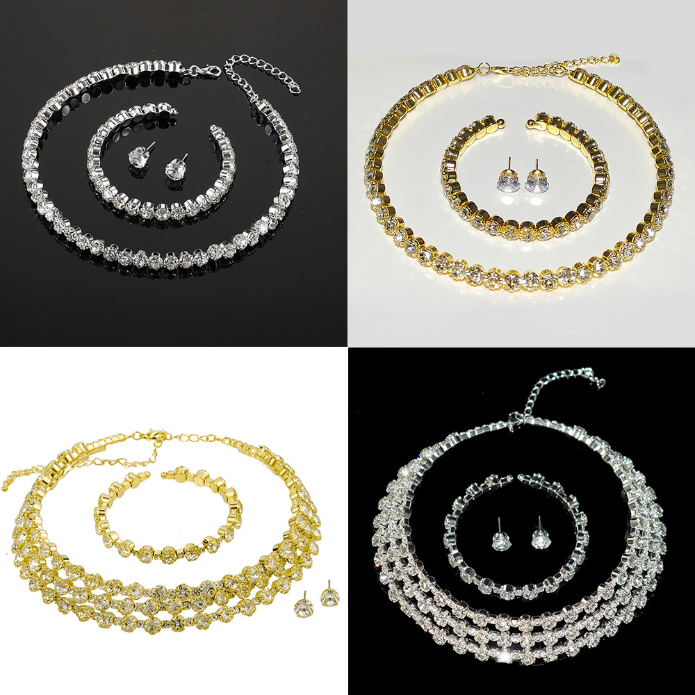 Cross-Border Bridal Rhinestone Jewelry Set Rhinestone Full Diamond Necklace Earrings Bracelet Three-Piece Set Claw Chain Necklace Wholesale