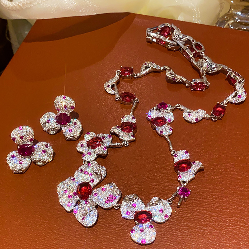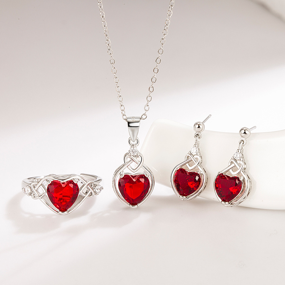 2025 New Heart Heart Shaped Zircon Necklace Earrings Ring suit Opening Adjustable Ring Garnet Red Water
