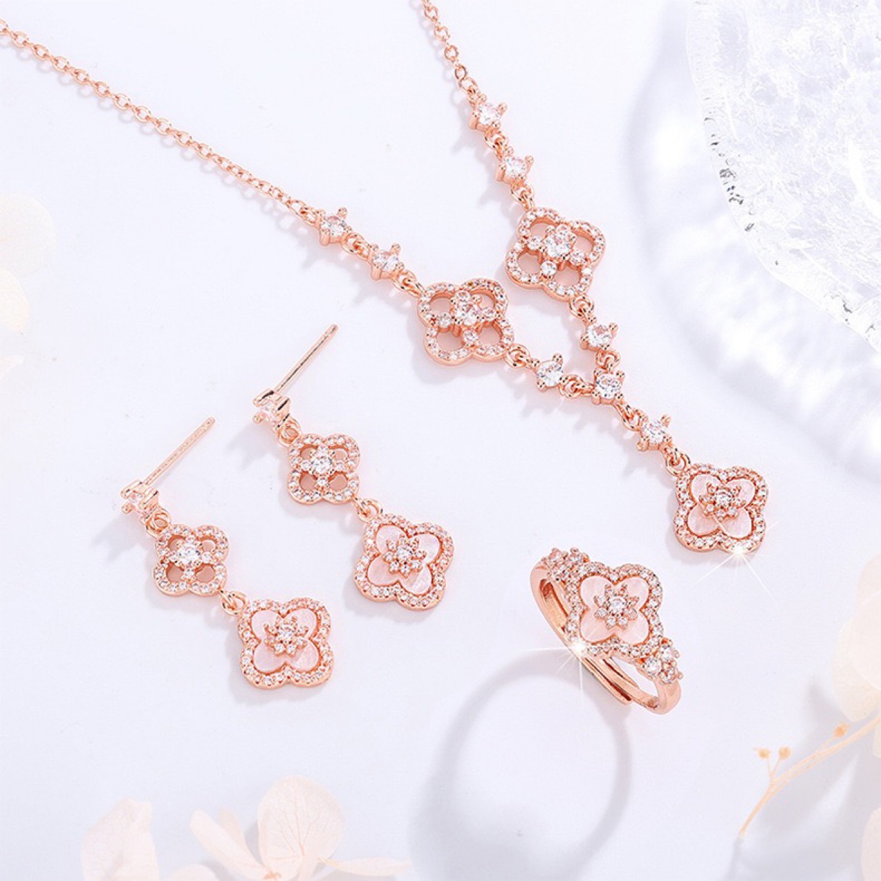 New Fashion Light Luxury Zircon Four-Leaf Clover Necklace Set for Women, Niche Exquisite High-Value Pink Shell Earrings, Fresh Style