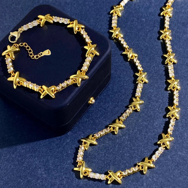 Light Luxury Cross-Border Copper Gold-Plated Micro-Inlaid Rhinestone Letter X Necklace Bracelet Jewelry Set High-End Tiktok Hot Sale