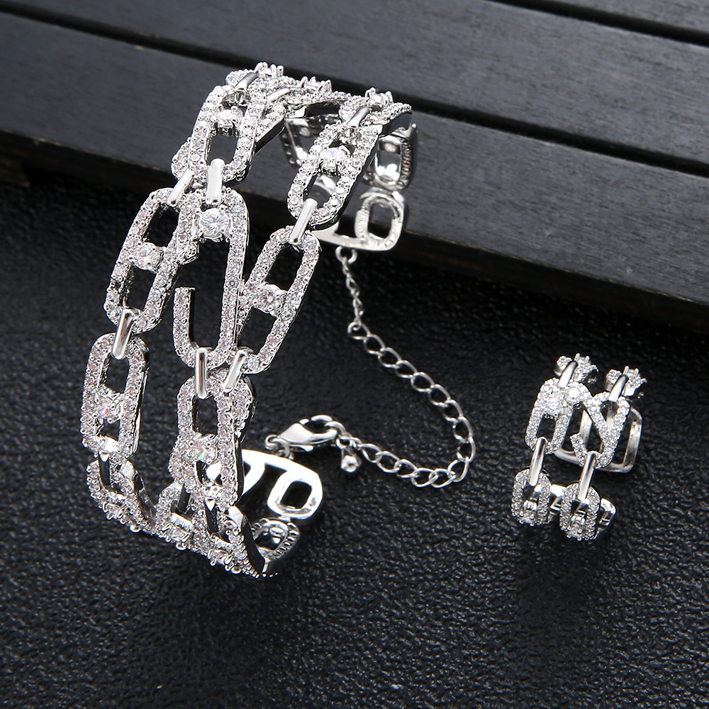Cross-border Explosions Temperament Pap Square Zirconium Full Diamond Bracelet European-style Personality Exaggerated All-match Bracelet Ring Set