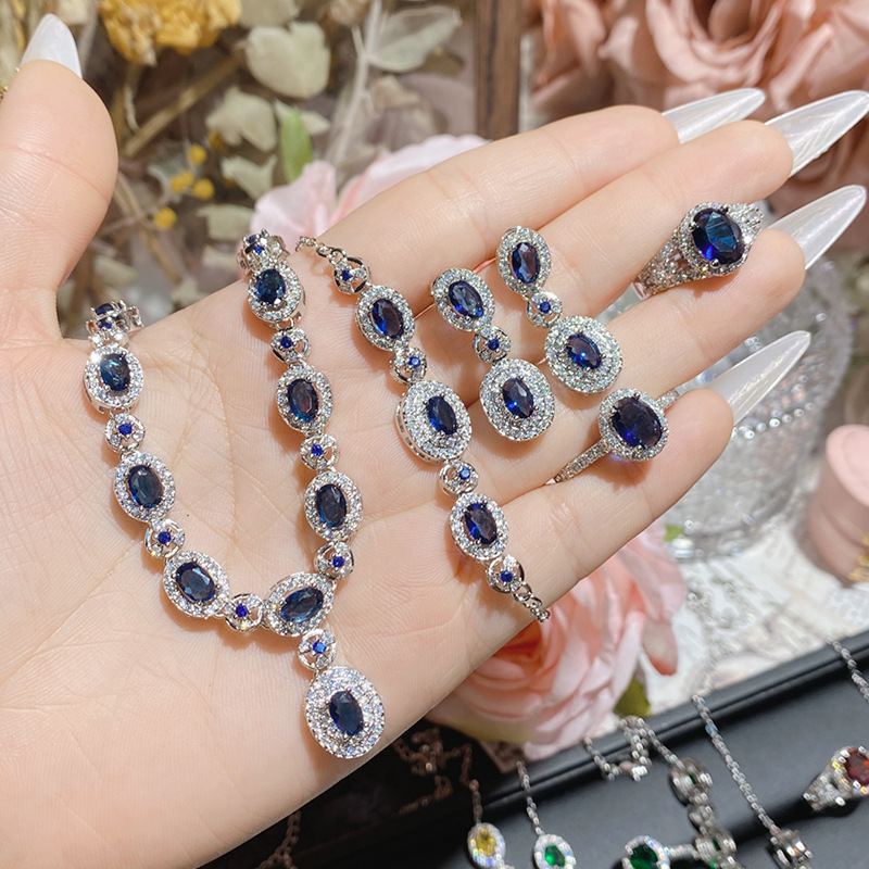 Camellia European and American luxury fashion bride Tan sang Blue jewelry suit plated 18K high-grade design color treasure hand jewelry
