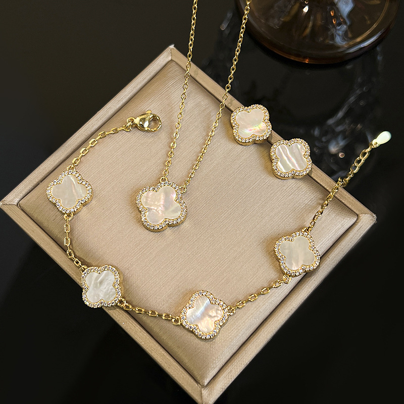 Jewelry Set Jewelry Natural White Shell Four-Leaf Clover Earrings Necklace Bracelet Full Diamond Women's High Fashion Wholesale