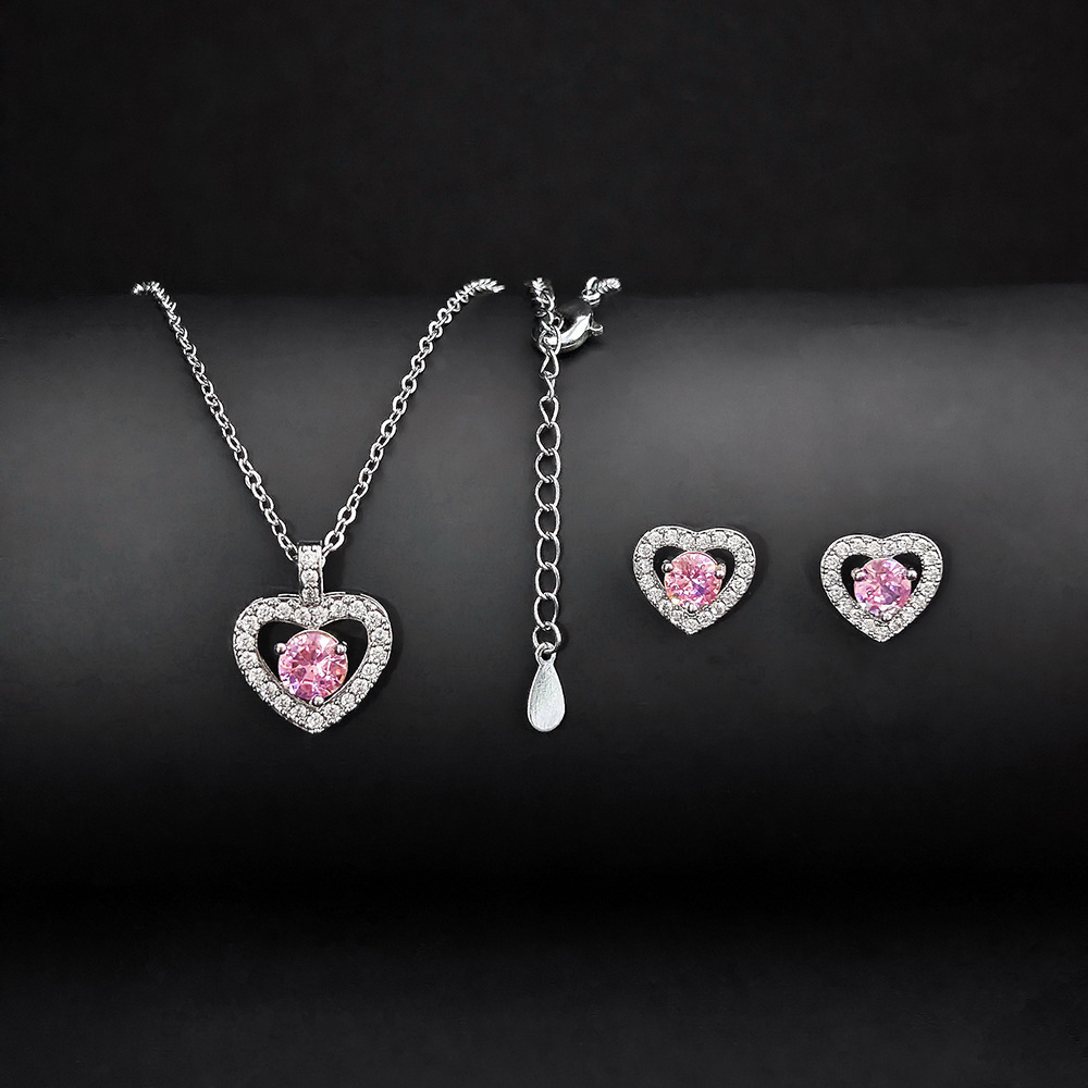 Popular Amazon Aliexpress Cross-Border Zircon Women's Earrings Ring Heart-Shaped Pendant Necklace Set Love Pink