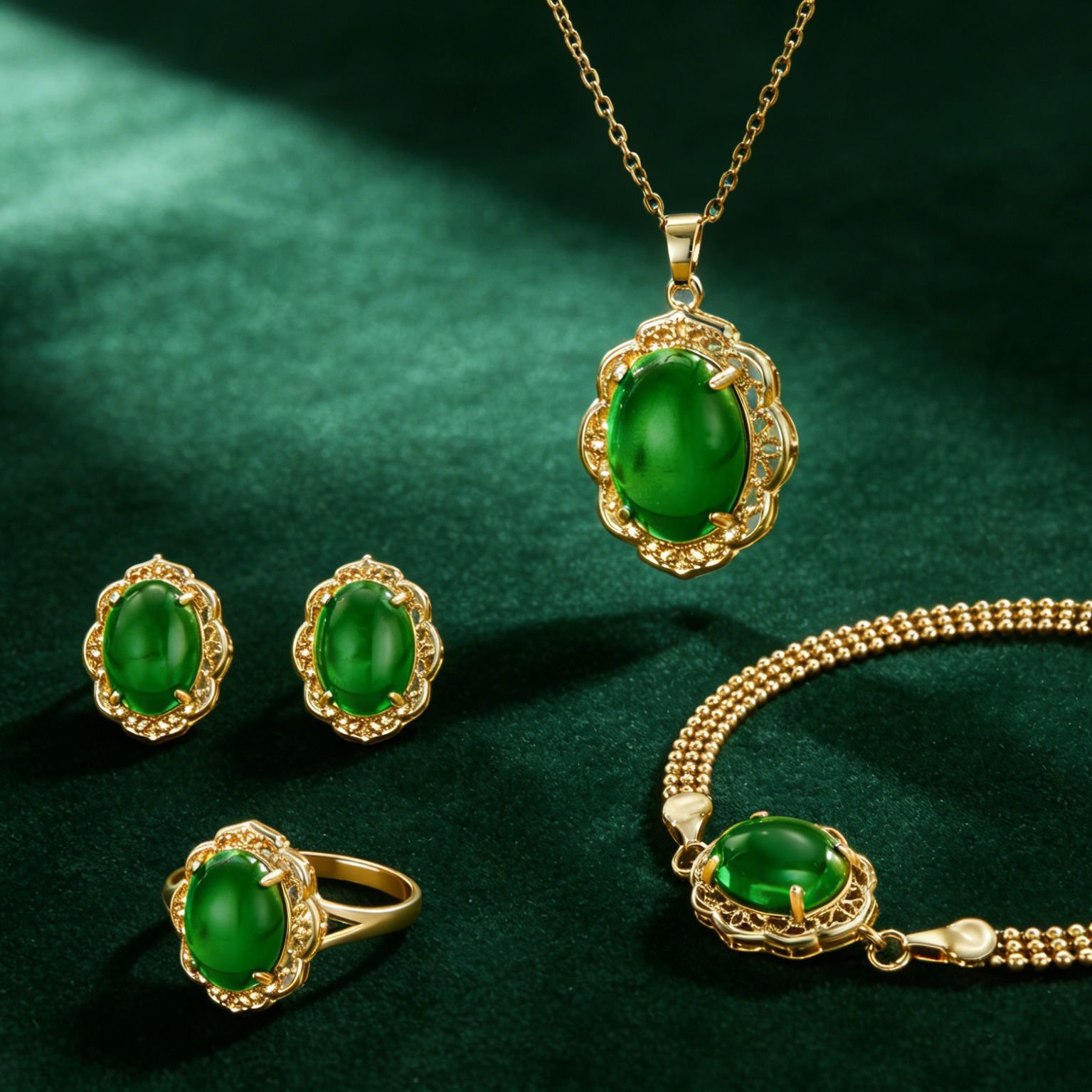 New Chinese Style Emerald Four-Piece Set of Jade Necklace, Bracelet, Ring and Earrings, Luxurious and Luxurious Jewelry, Fast Delivery