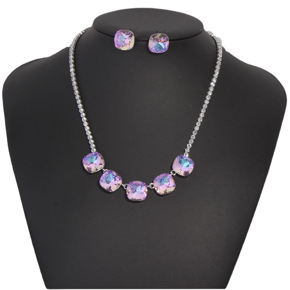 Fashion trend crystal luxury high necklace earrings suit ins purple small square two-piece clavicle chain necklace