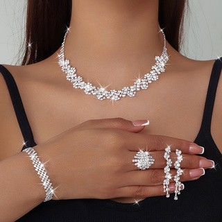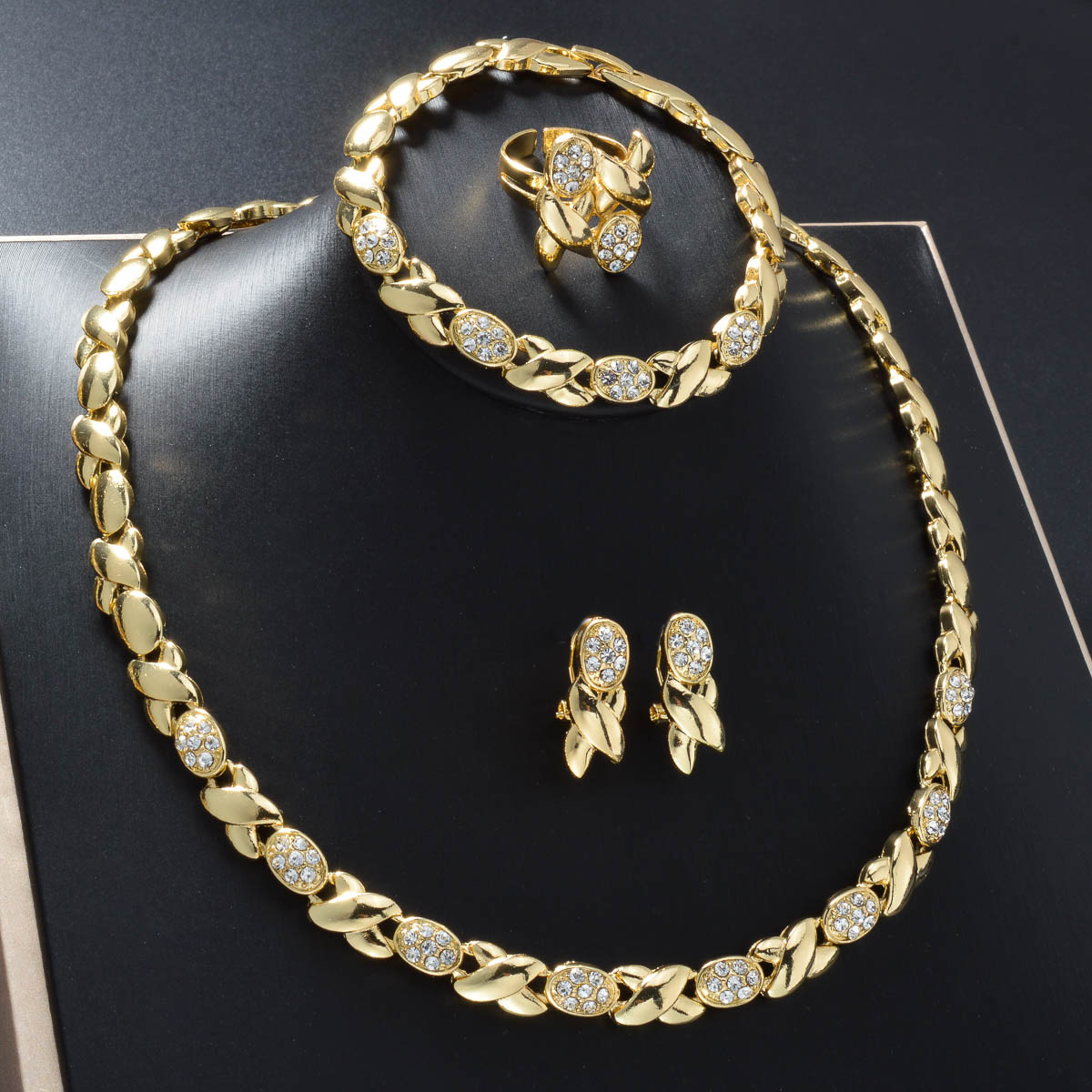 Amazon Cross-Border New Jewelry Set Geometric Twist Rhinestone Copper Necklace Earrings Bracelet Ring Wedding Set