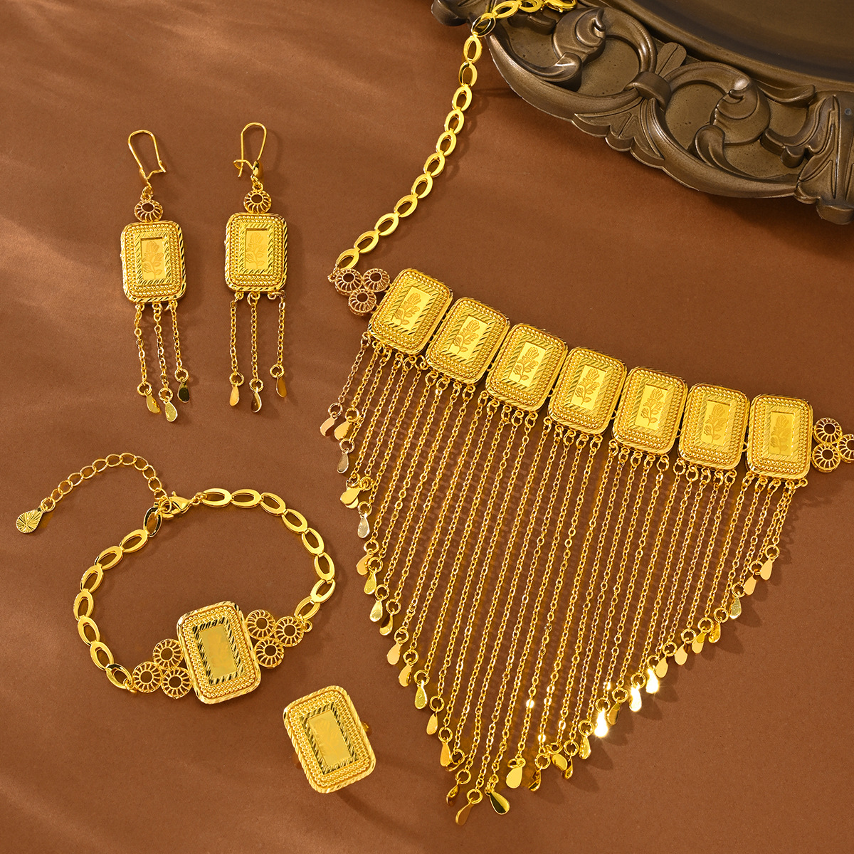 Laser Carved Rose Pattern 24K Gold-Plated Four-Piece Necklace Earrings Bracelet Ring Set Middle East Cross-Border Wholesale
