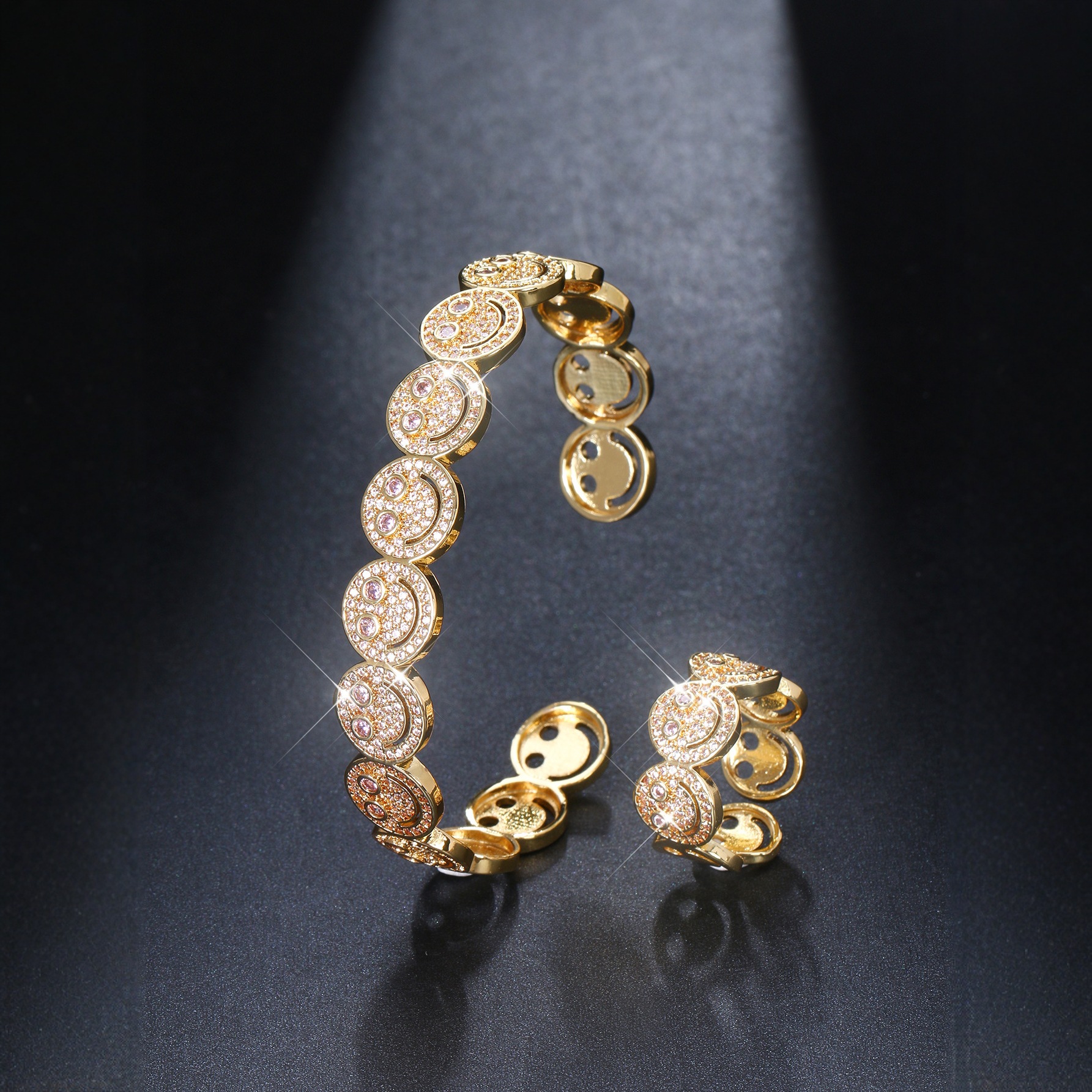 European and American Hip-Hop Light Luxury Zircon Smiley Face Unisex Bracelet and Ring Set Fashion Versatile Open Hand Jewelry