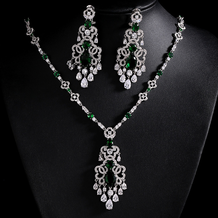 European and American long emerald zircon necklace earrings suit bride dinner wedding dress jewelry women's high-end accessories