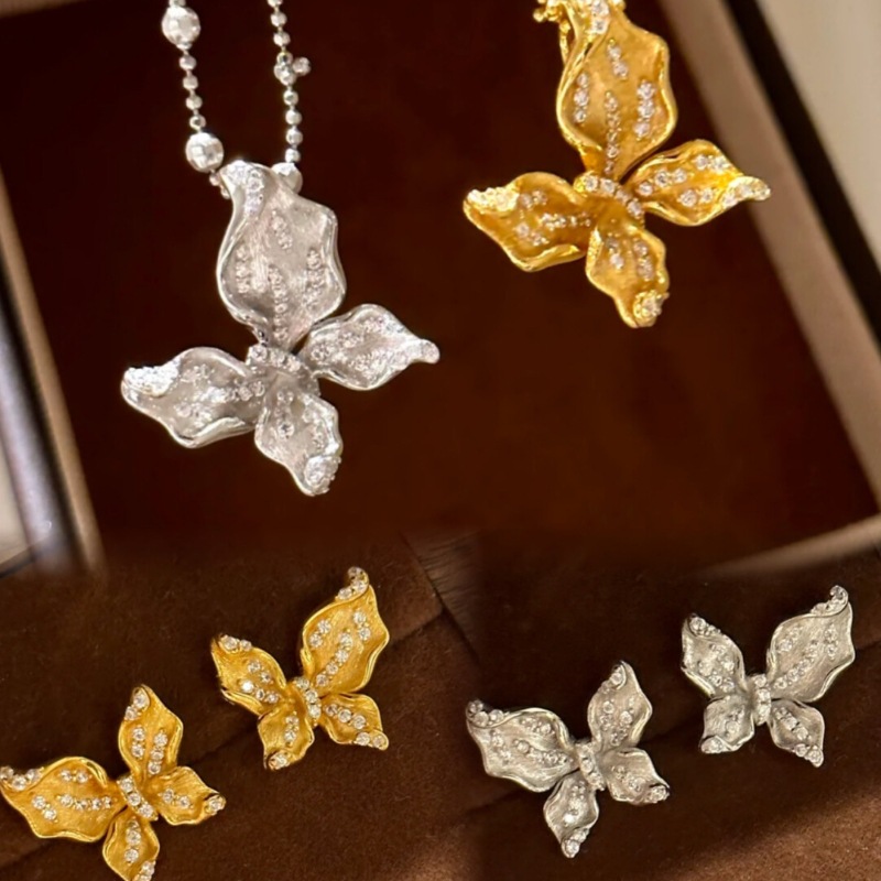 French Entry Luxury Vintage High-grade Brushed Diamond Dancing Butterfly Earrings Necklace Exquisite Personalized Ancient Jewelry suit