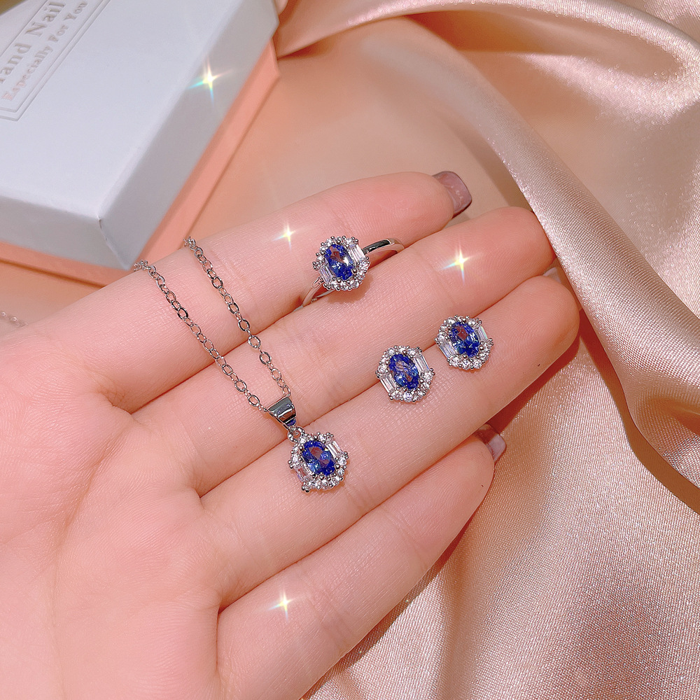 2021 New Hot Inlaid Sri Lanka Sapphire Set Pendant Earrings Ring Three Piece Set Wholesale