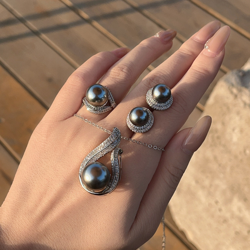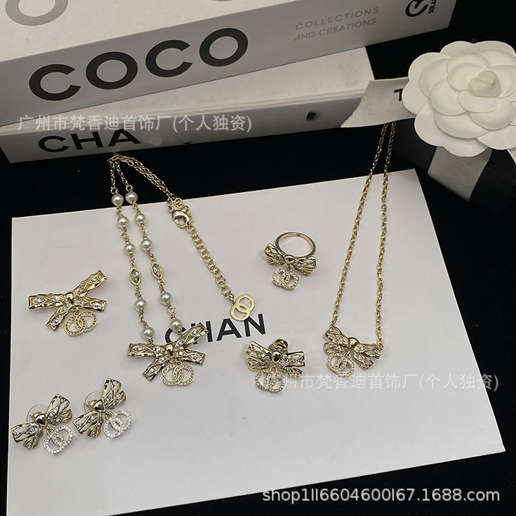 Grandma Xiang 24B Cut Out Bow Pearl Necklace Gentle Elegant High-End Diamond Earrings Brooch Set