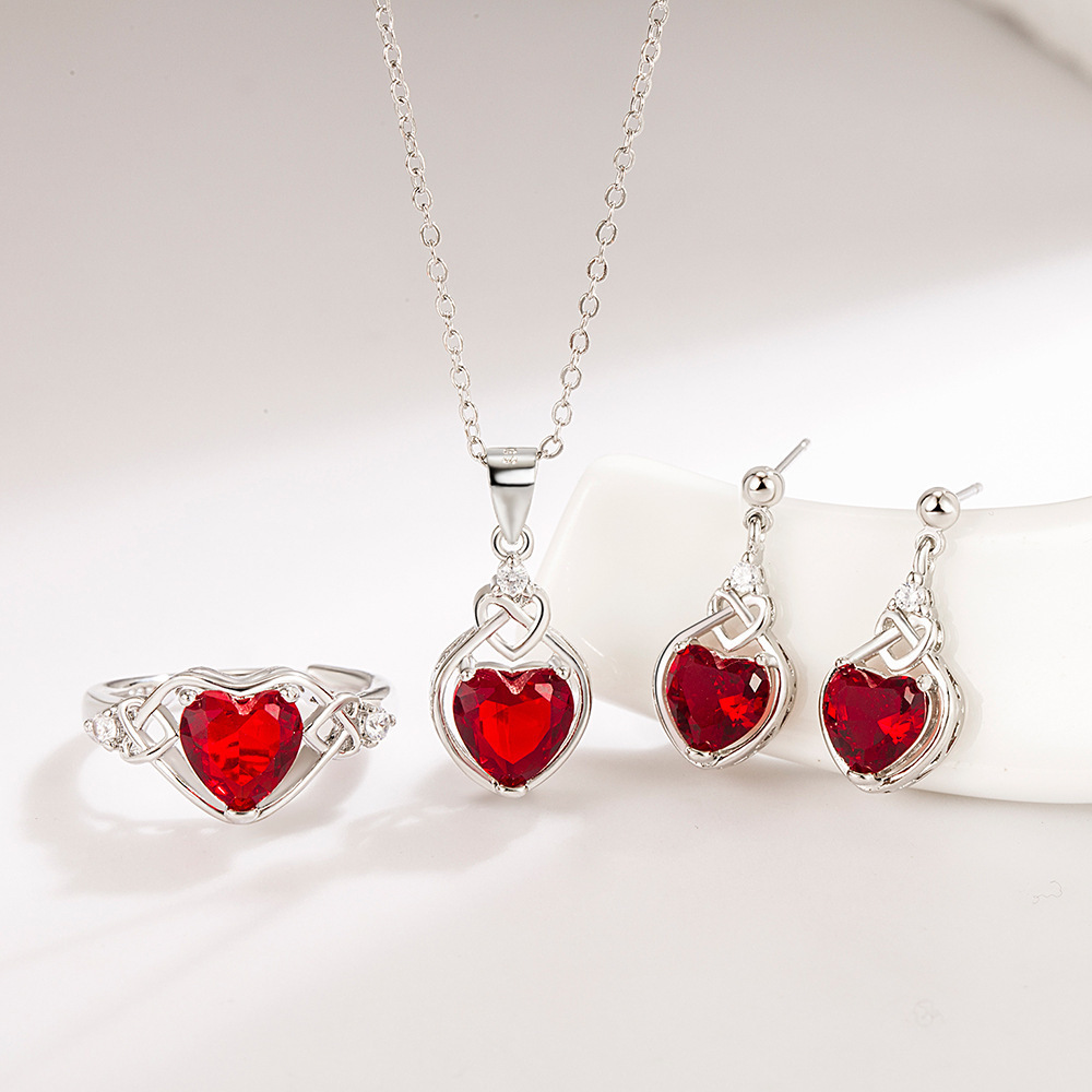 New Heart-Shaped Pomegranate Red Zircon Necklace, Earrings and Ring Set Amazon Cross-Border Best-Selling Jewelry