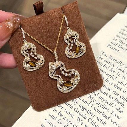 Tiger Eye Stone Pearl Flower Gourd Earrings Necklace Light Luxury High-End Clavicle Chain Feminine Versatile Jewelry Set