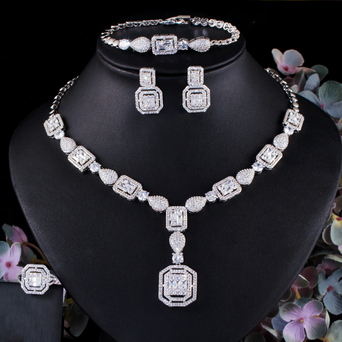 Bridal Wedding Necklace Earrings Ring Bracelet Zircon suit Wedding Dress Accessories Square Zircon Four-piece Set