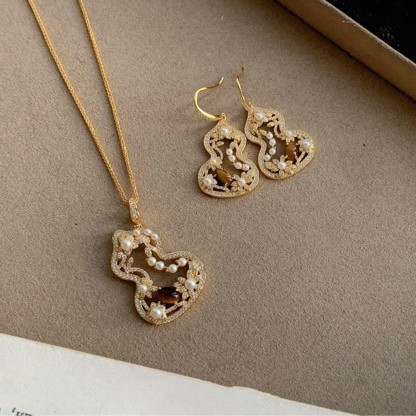 New Popular Autumn and Winter Essential Natural Tiger Eye Pearl Gourd Necklace and Earrings Set, Light Luxury, High-End Niche and Versatile