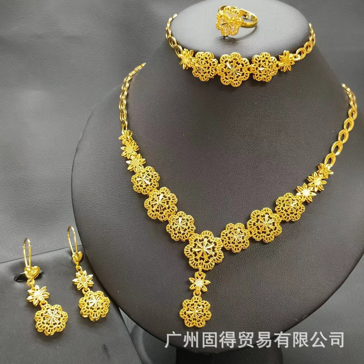 Imitation Gold Flower Necklace Earrings Bracelet Ring Jewelry Set 24k Copper Gold Plated Dubai India Bride Jewelry