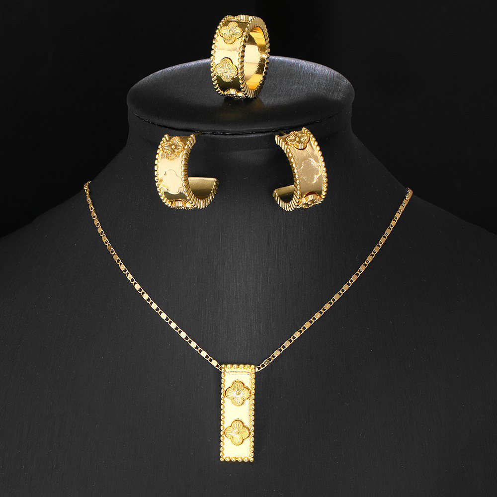 Fashionable Charm Four-Leaf Clover Kaleidoscope Ring Necklace Earrings Three-Piece Set Women's Ring Opening Adjustable Cross-Border