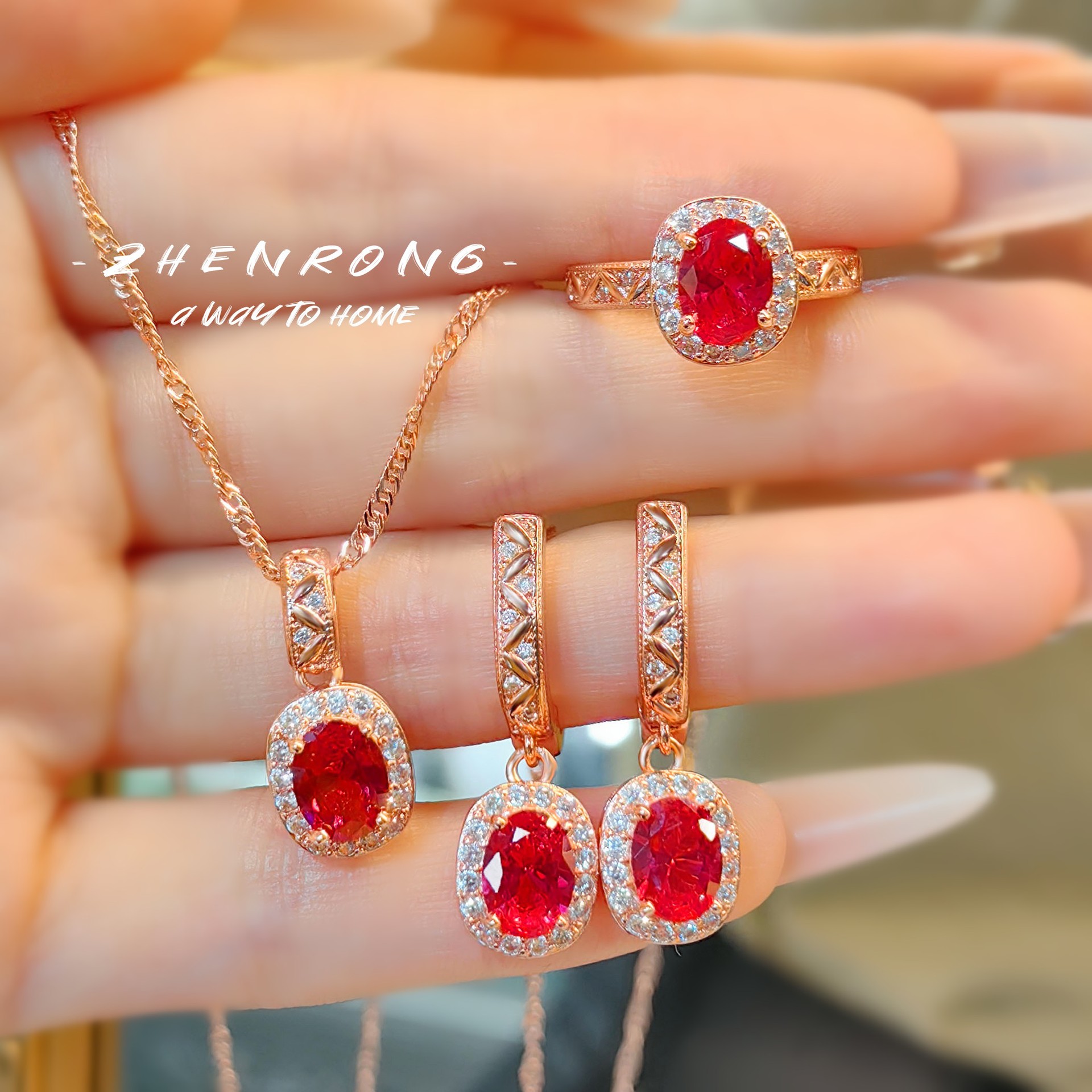 Light Luxury Vintage Pigeon Red Corundum suit Mother's Day Pendant Caibao Earrings High Carbon Diamond Necklace Ring Bracelet