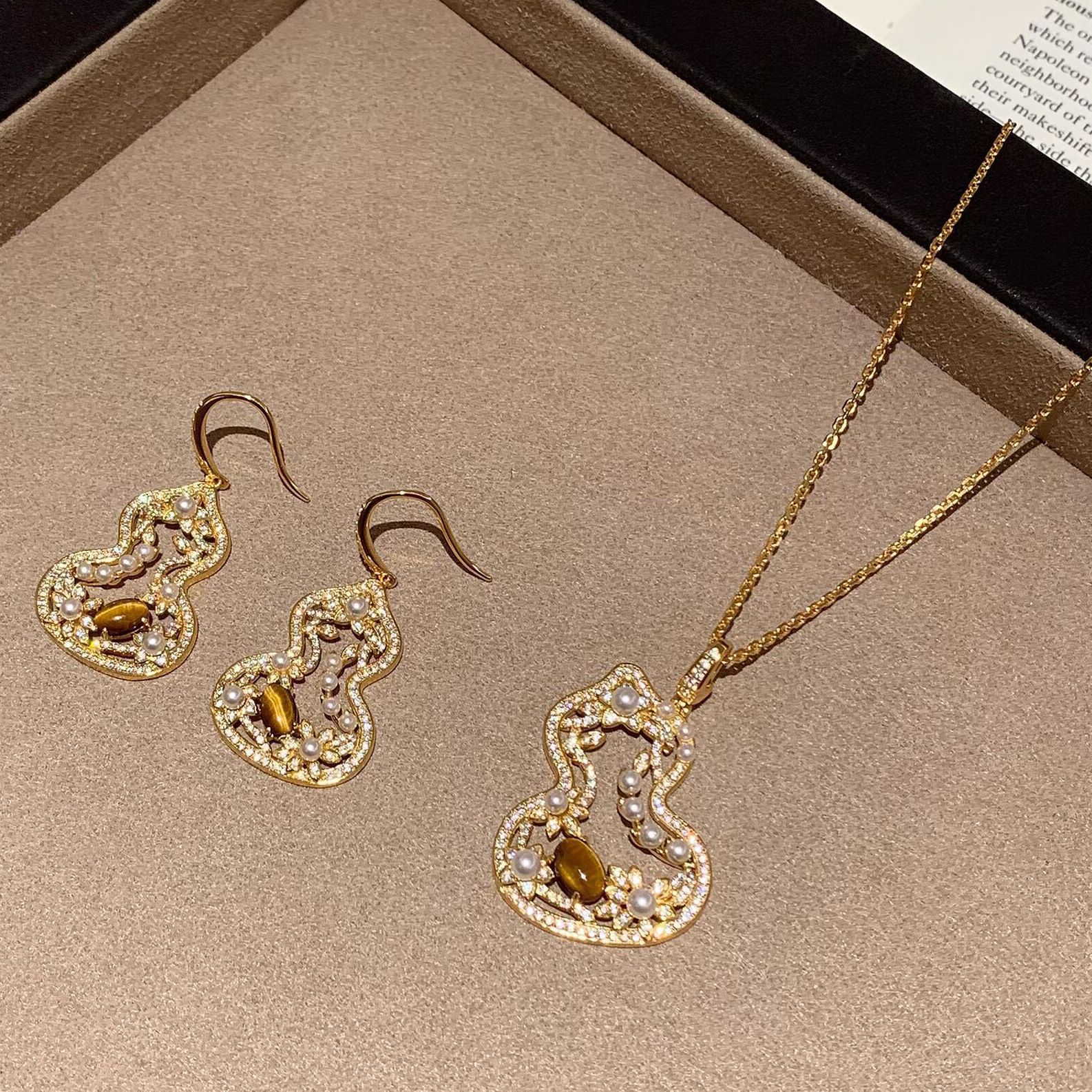 Stainless Steel Gourd Pearl Necklace Ear Hook New Chinese Style Versatile Pendant Clavicle Chain High-End Fashion Jewelry Set