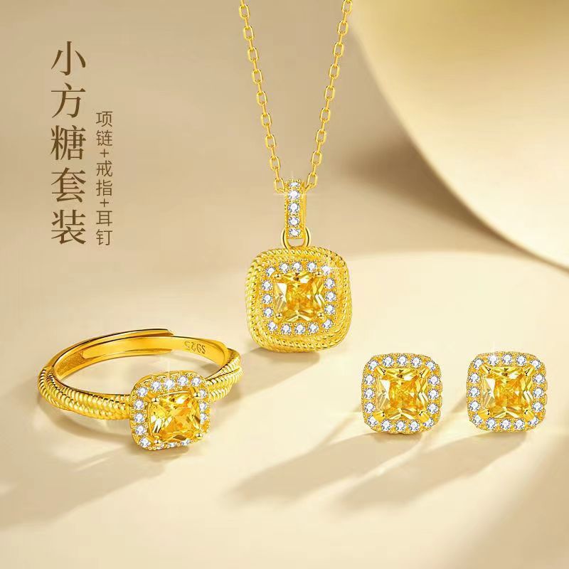 Vietnamese Sand Gold Diamond Sugar Cube Pendant Women's Simple Small Sugar Cube Ring Earrings Jewelry Copper Gold-Plated Jewelry Set