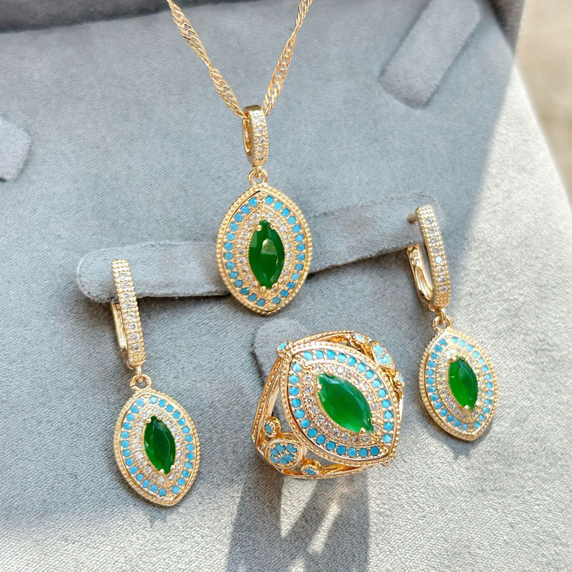Gulkina Russian 585 Jewelry Purple Gold Color Gold Emerald Color Zircon Vintage Jewelry suit Earrings Ring Set