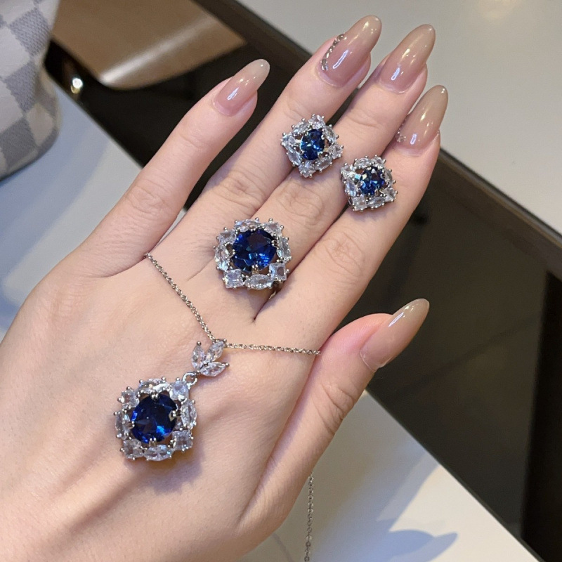 High-grade bright color sapphire fashion design luxury temperament super flash ring necklace earring jewelry three-piece set