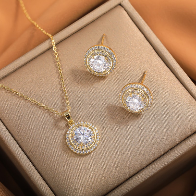 Shiny Pearl Copper Earrings Necklace Set Round Non-Fading Women's Light Luxury High-End Cross-Border Wholesale Jewelry