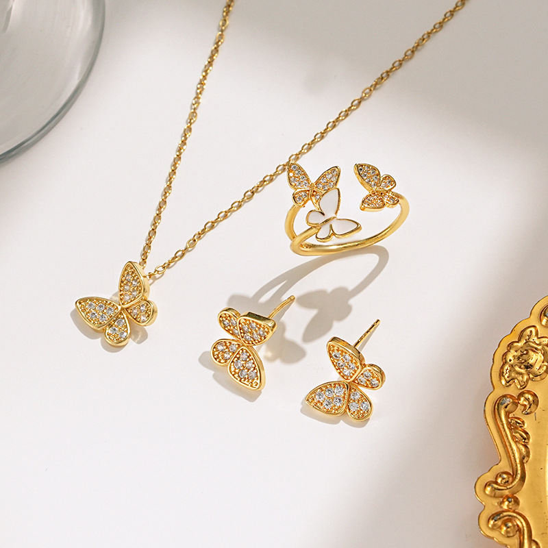 Fashion Butterfly Three-piece Titanium Steel Necklace Women's Light Luxury All-match Inlaid Zircon Earrings Ring High-end Jewelry