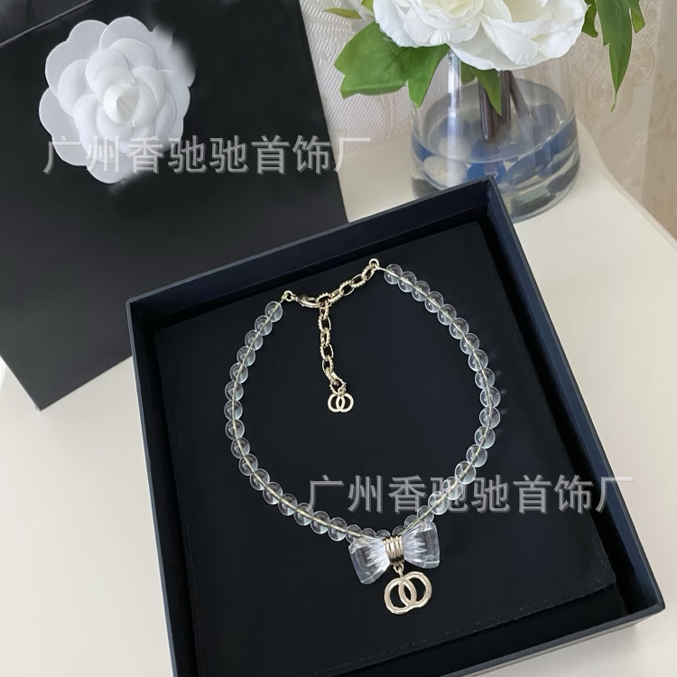 Xiaoxiang style spring and summer new 25p bow glass beads necklace fashion Joker little red book with earrings suit