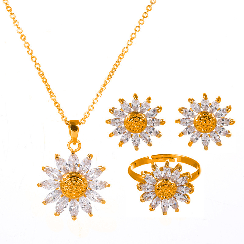 Amazon Niche Copper Jewelry Zircon Sunflower Earrings Necklace Ring Set Jewelry Bridal Jewelry Three-Piece Set