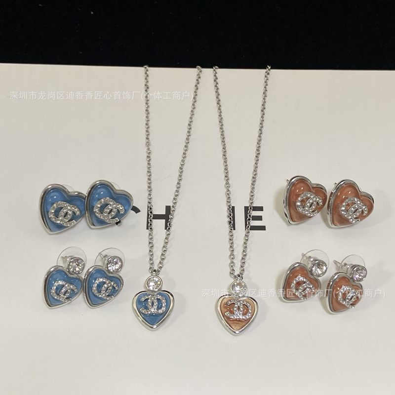 Real shot 25p Xiangjia suit blue love necklace fashion sense double C colored glaze earrings female chain clavicle earrings series
