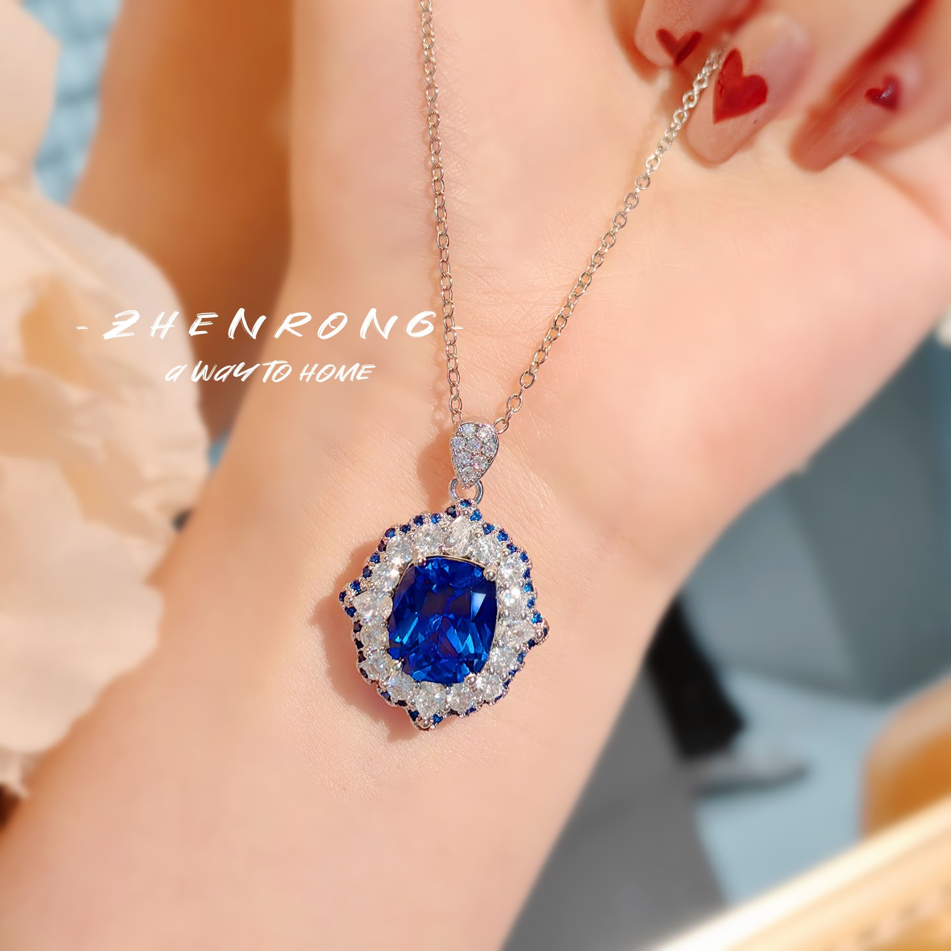 Vintage Blue Pointed Crystal Pendant Light Luxury High Carbon Diamond Earrings Zircon Necklace Sense Diamond Ring Color Treasure suit Women