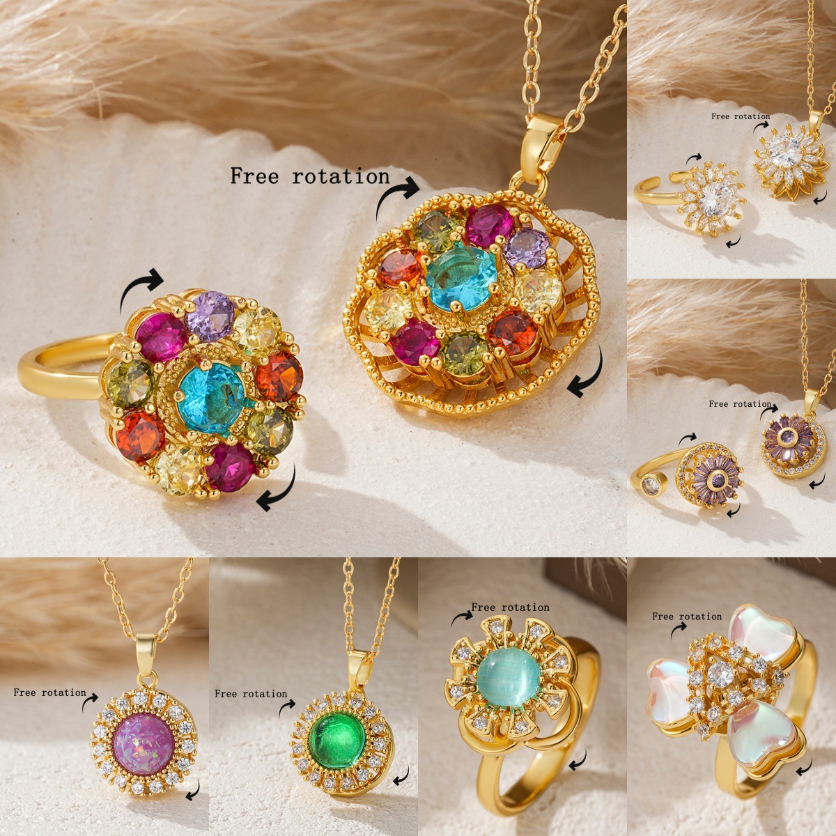 Stainless Steel Women's Necklace, Light Luxury Niche Copper Inlaid Colorful Zircon Flower-Shaped Open Adjustable Ring Set