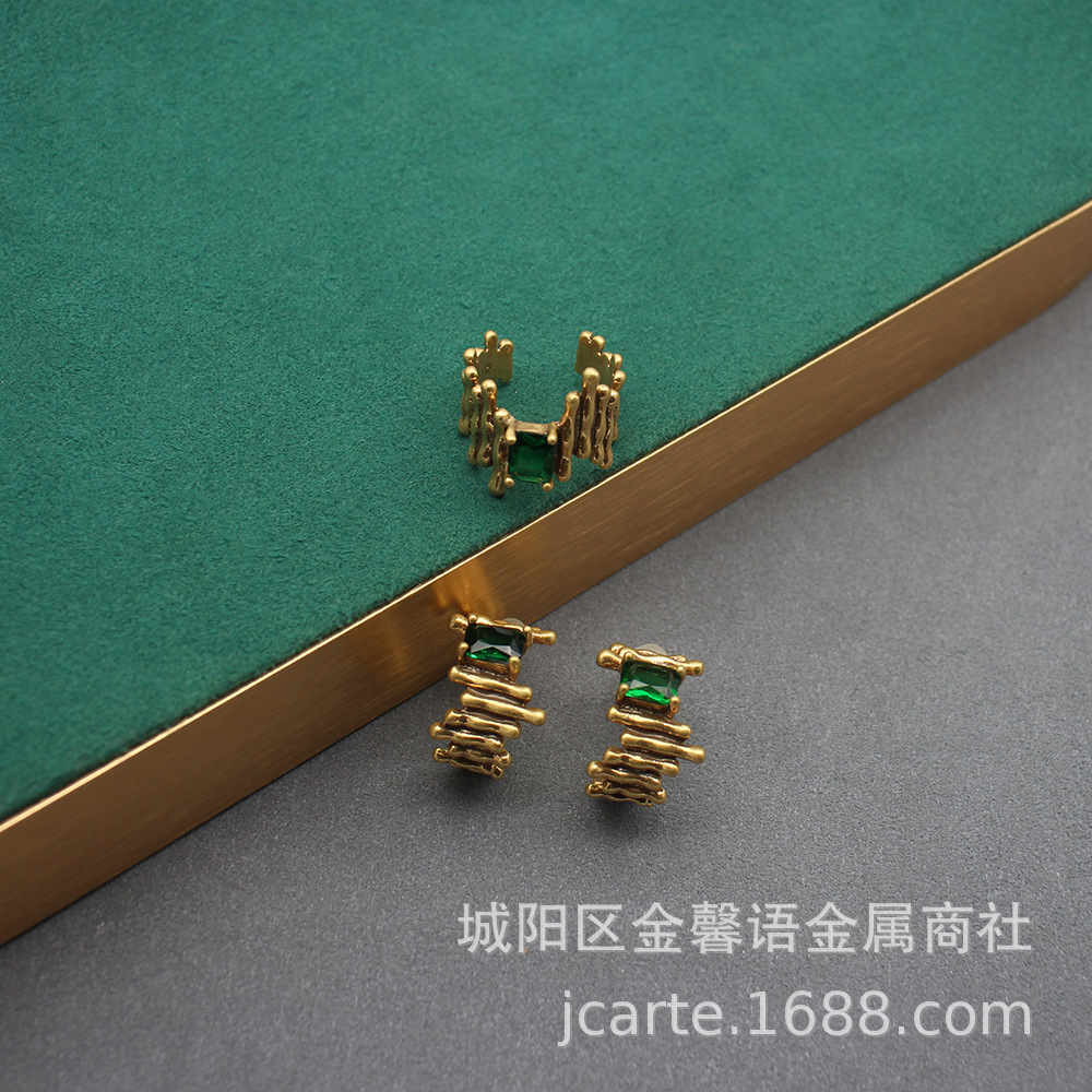 Qingdao Middle Ancient Jewelry Fashion Wrinkle Irregular High-end Sense Earrings Female C- word Zircon Earrings Ring suit