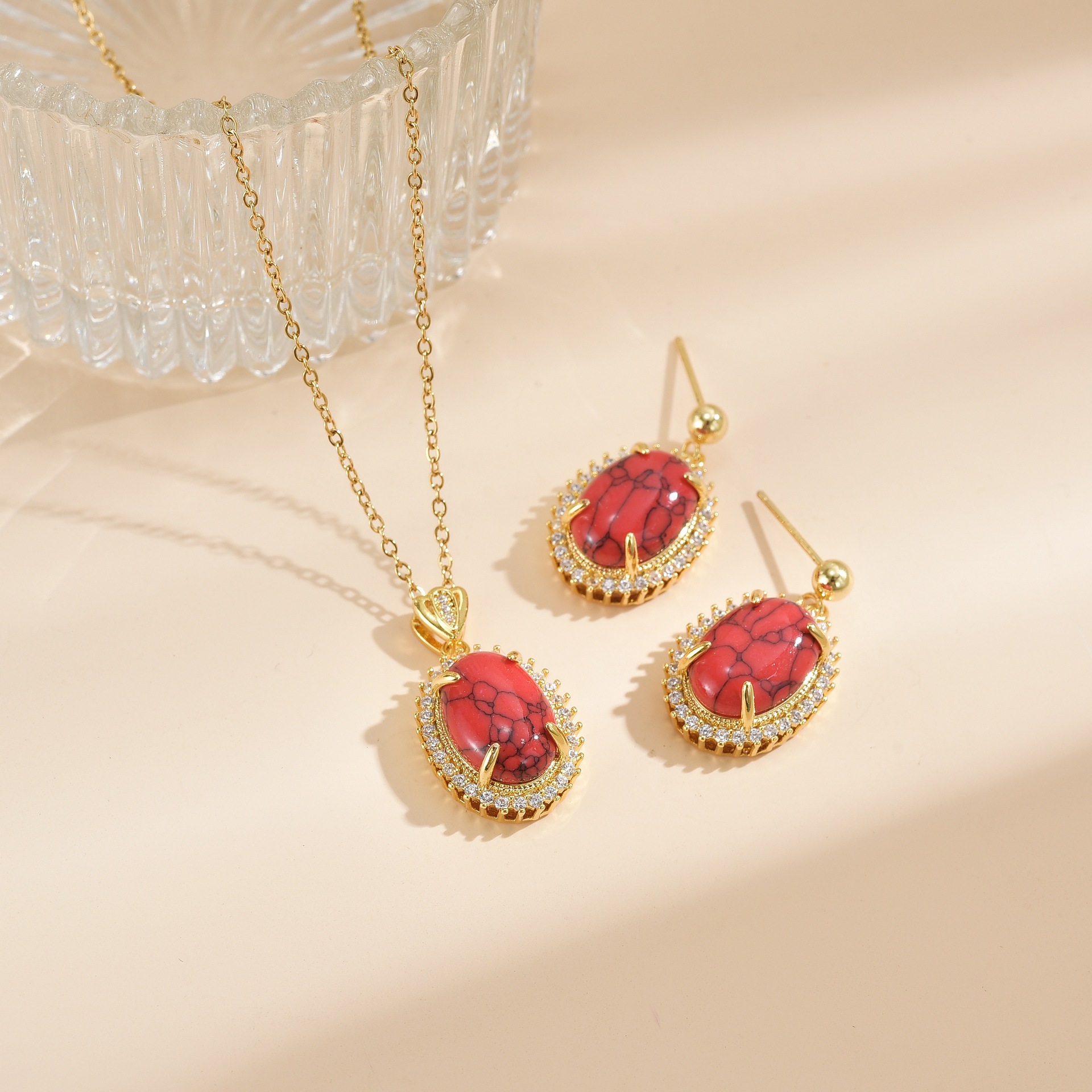 Fashion Versatile Cinnabar Red Turquoise Pigeon Egg Necklace Women's Light Luxury Niche High-End Earrings Necklace Set Wholesale
